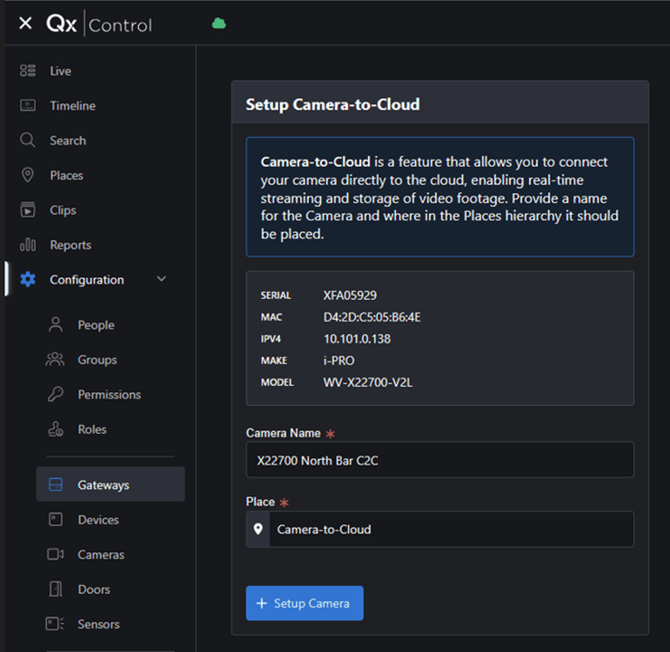 - Pressing the “Setup” button will connect the Qumulex cloud to the camera. Upon completion, you will be taken to the gateway page in QxControl.