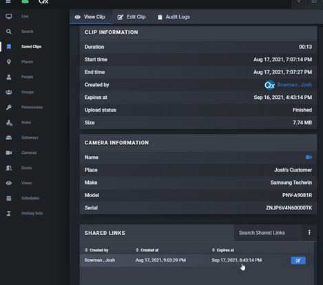 The August 2021 QxControl update is now live! In this update, users are now able to save video clips into the cloud service in addition to downloading to your local device. This update also introduces the ability to share these video clips with ease. Simply choose an email recipient or share via a link. This new feature also allows full control to delete or set the link to expire after sharing and includes an audit page to see who is accessing the video clip and when. In addition, each Camera Info page will display how much cloud storage is available and is being used by exported video clips.